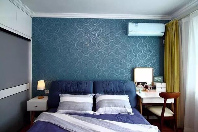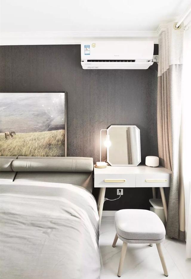 對(duì)于臥室面積較小,然后又想放兩個(gè)床頭柜的業(yè)主,不妨可以把梳妝臺(tái)放在電視墻,與電視柜平齊排放;